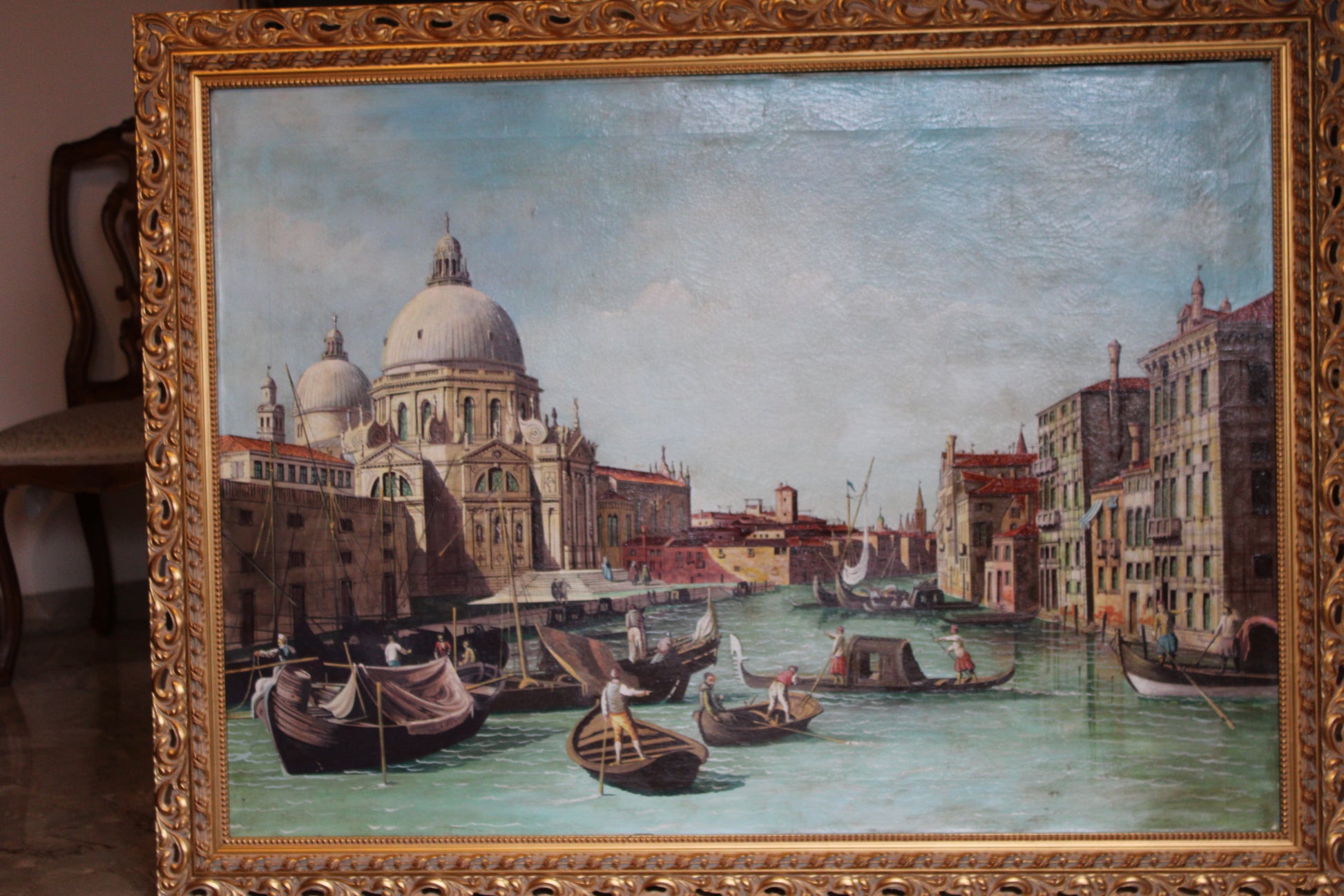 Giovanni Antonio Canal, detto anche Canaletto(1697-1768), nato e vissuto a Venezia, e che firmava i suoi lavori in modo discreto con la sigla A. C., è noto soprattutto come vedutista. L'opera qui in vendita è una copia antica della "Veduta del Canal Grande verso occidente con la Chiesa della Salute".