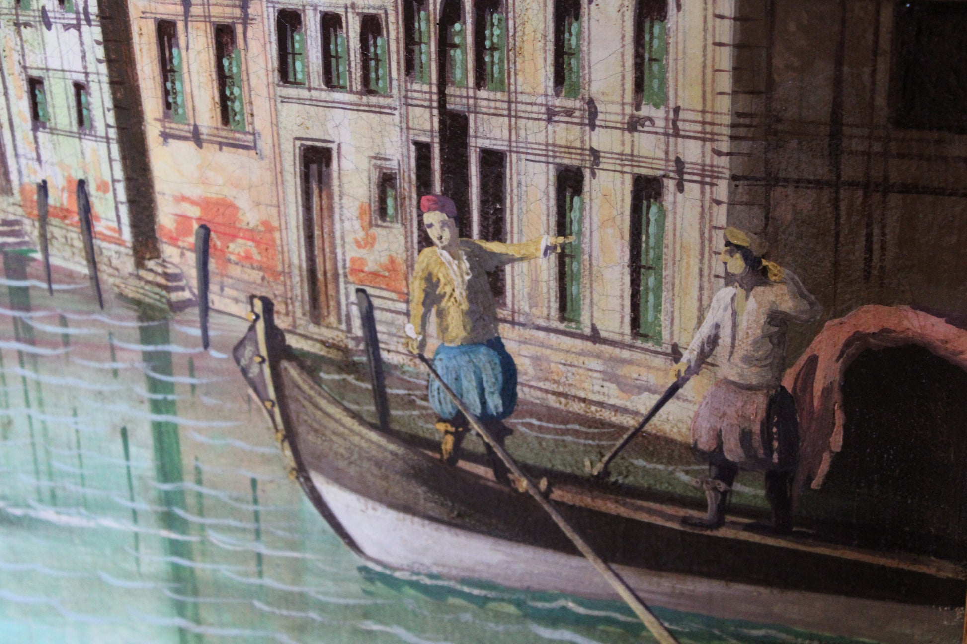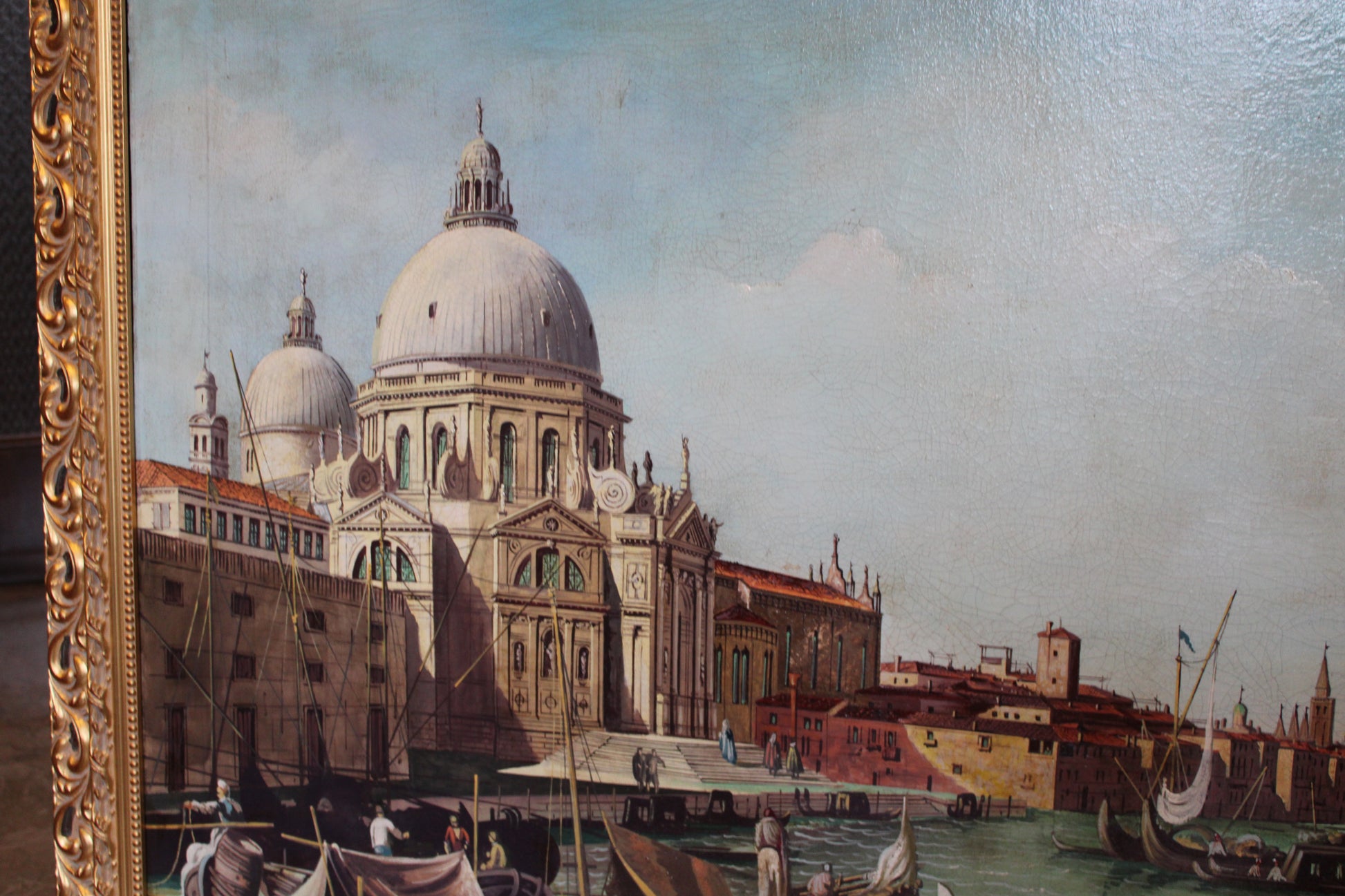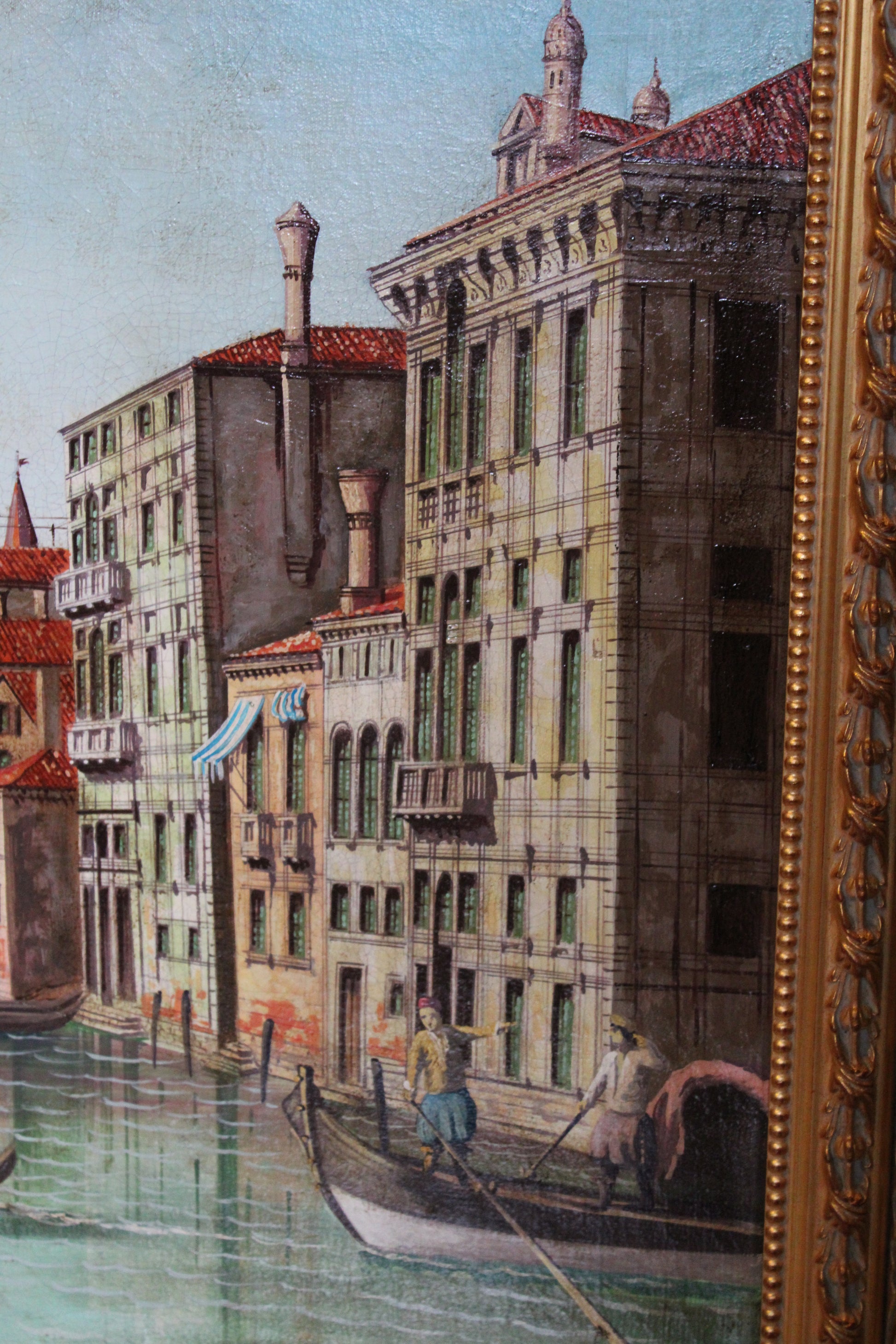 In particolare l'opera è riferibile a una bottega di alto livello per l'unica resa architettonica, frutto sicuramente della conoscenza in prima persona dell'opera di Canaletto e forse dell'uso dei suoi disegni. Si può asserire questo per il dettaglio con cui sono resi i particolari, e per il fitto craquelé (vedi foto dei dettagli) che caratterizza il dipinto, nonchè per l'uso della riga(vedi particolari in foto) e per la perfetta prospettiva, che è quasi sempre assente nelle altre copie. Bisogna ricordare che Canaletto faceva uso della riga e del compasso per disegnare e dipingere.