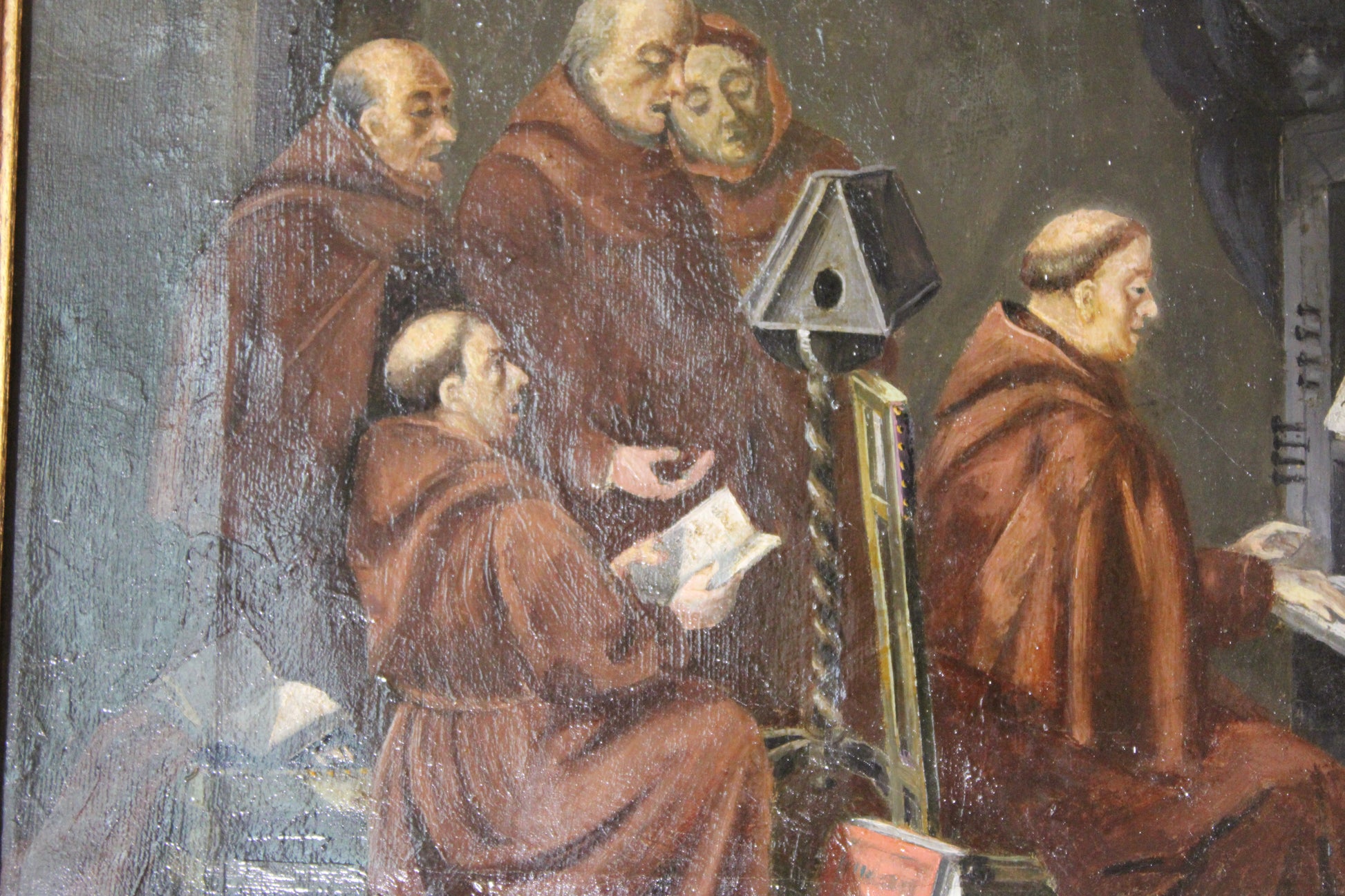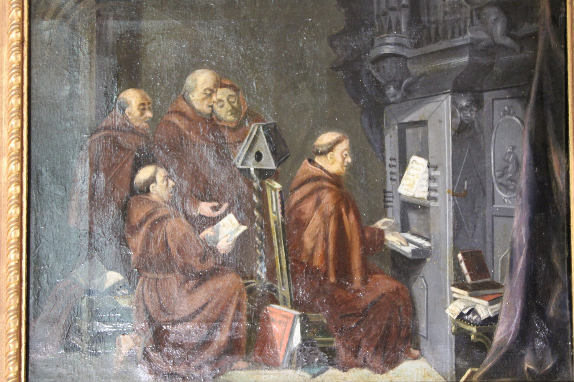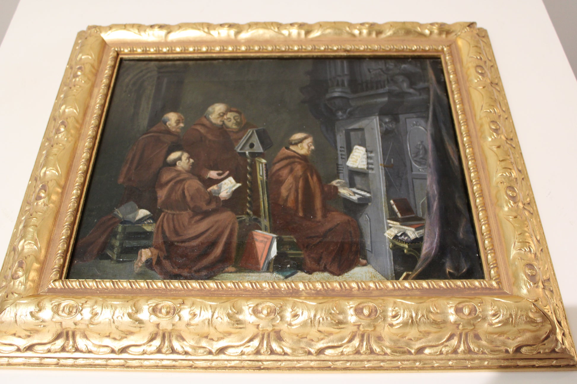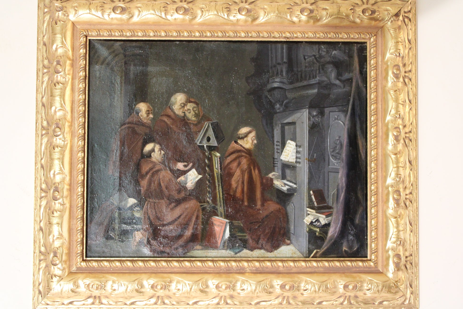 Une charmante et originale huile sur toile représentant des moines chantant. Ce tableau, dépourvu de son cadre d'origine, mesure 31 cm x 41 cm sans cadre et 47 cm x 56 cm avec cadre. Il est attribué à Paul Thomas, dont les intérieurs sont également exposés au musée d'Orsay. L'œuvre présente de nombreuses caractéristiques propres au maître français et constitue sans aucun doute un ouvrage de grande valeur.