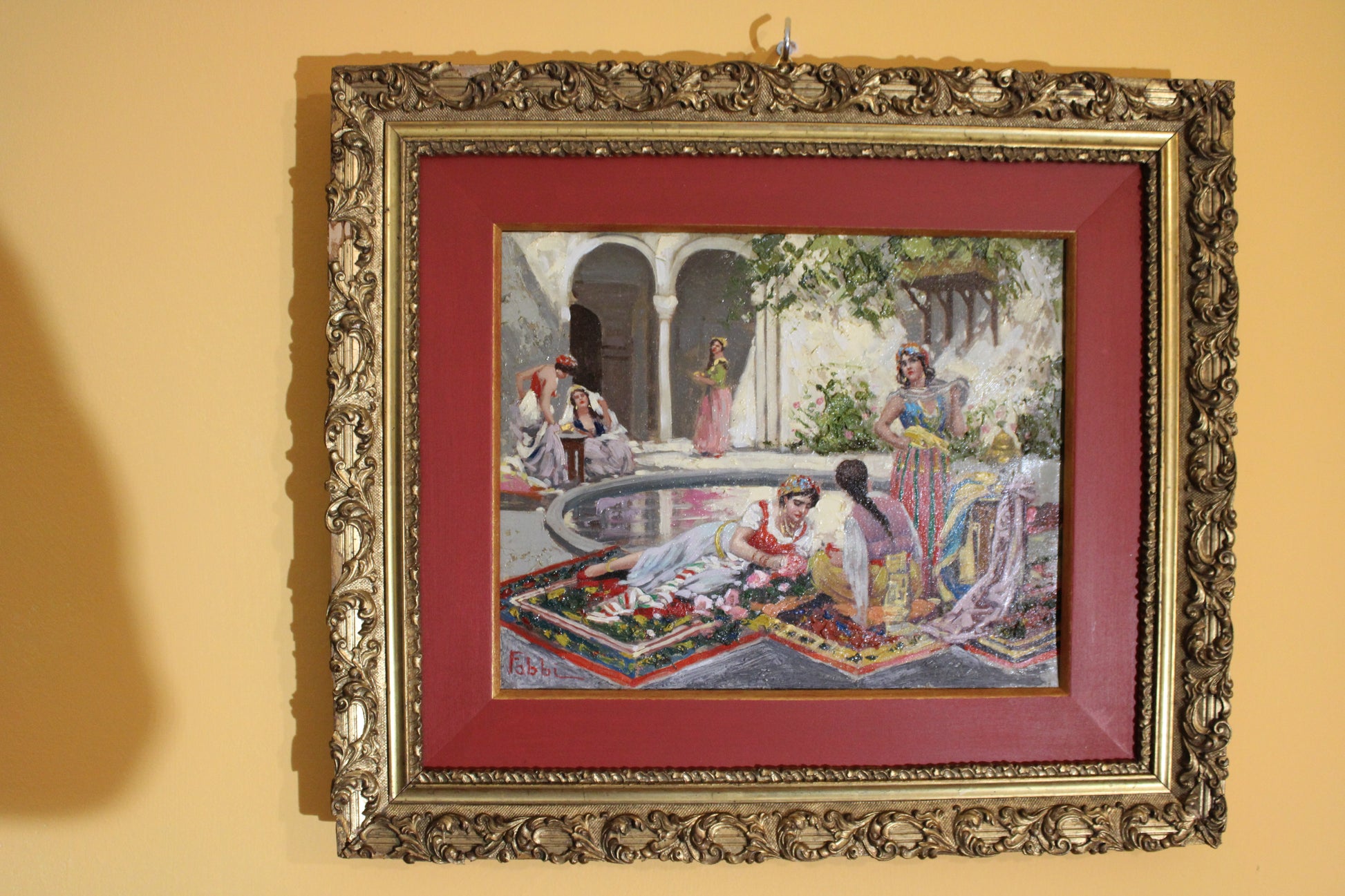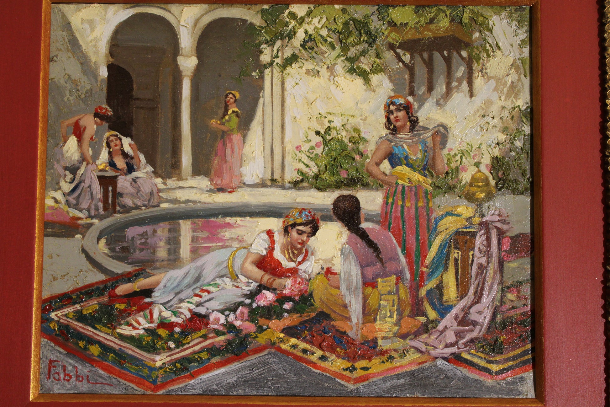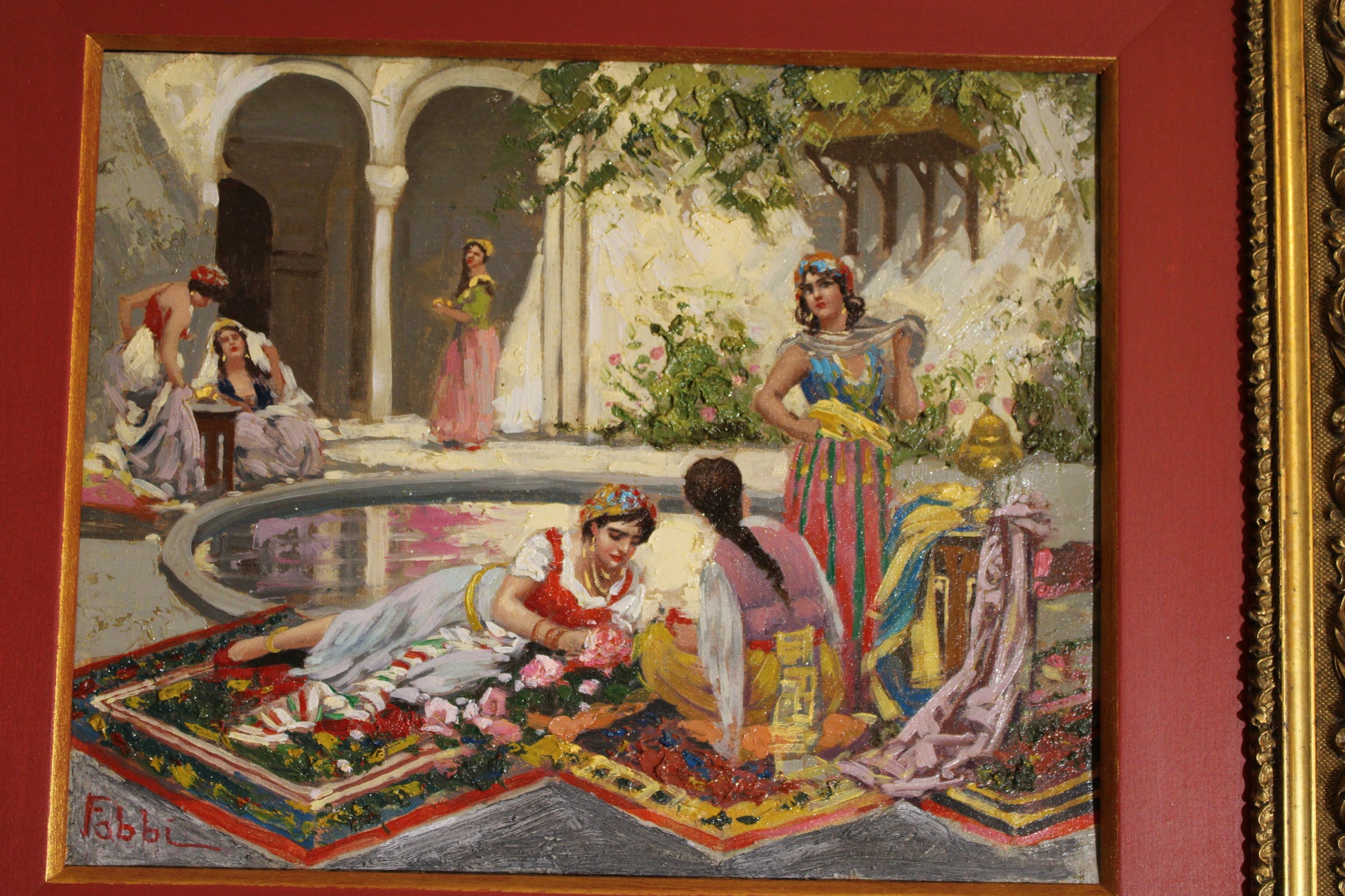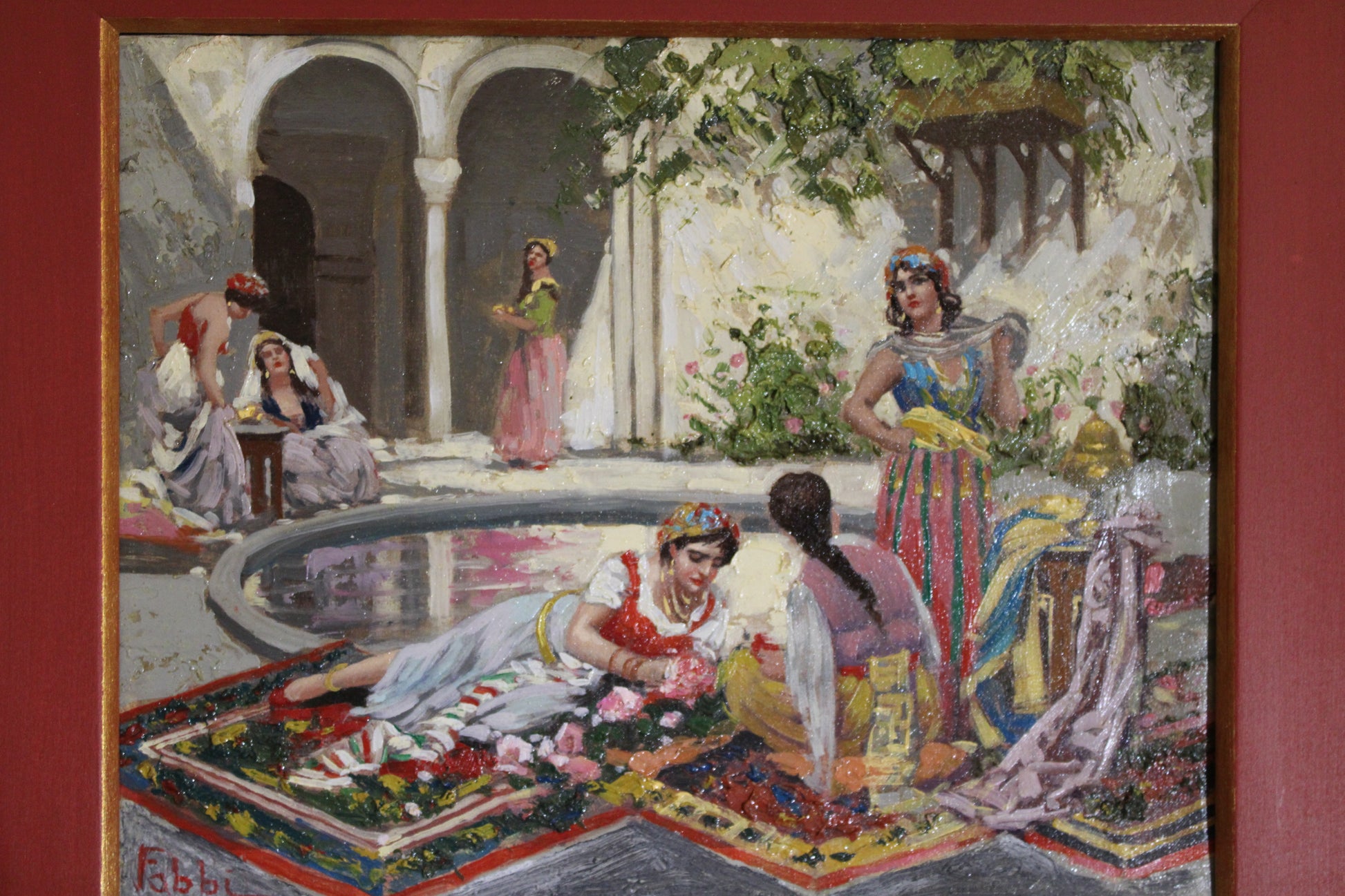 E' realizzato con grande attenzione al particolare; i colori, la presenza di queste fanciulle orientali, del tipico cortile descritto già in altre opere del Fabbi, dei tappeti persiani ne fanno un opera sicuramente da ricondurre alla paternità del grande artista bolognese.
